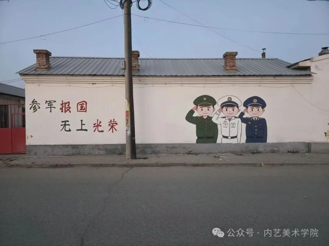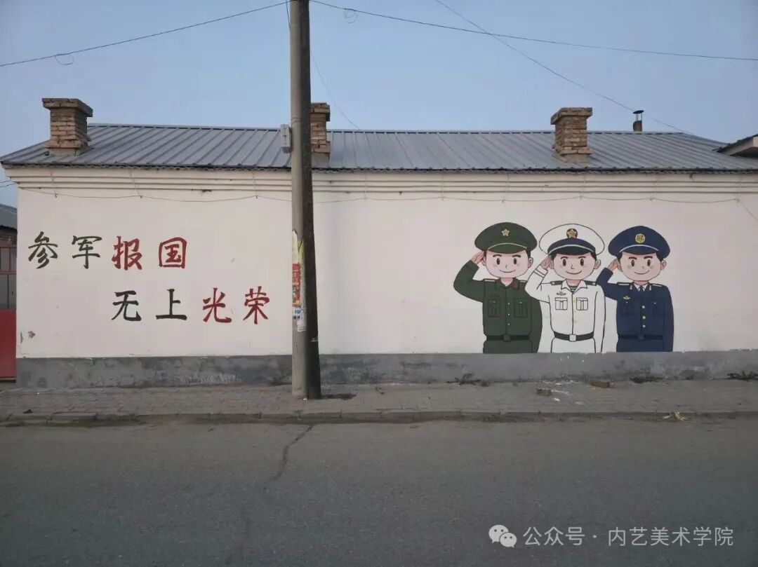 强国复兴有我,“参军报国 无上光荣”赫然在目。美术学院“三下乡”乡村振兴促进团将军旅题材融入到墙绘创作中,宣传基层武装建设,筑牢国防动员根基,传递着参军的崇高荣耀,点燃青年投身国防的热忱。一直以来,恩格贝镇高度重视征兵工作,积极响应国家号召,通过多种形式广泛宣传征兵政策,鼓励有志青年投身军营,为国防事业贡献力量,在实现个人价值的同时,也为保卫祖国的和平与安宁添砖加瓦。这些墙绘不仅美化了乡村环境,更如同一座座无声的宣传站,传递着积极向上的正能量。