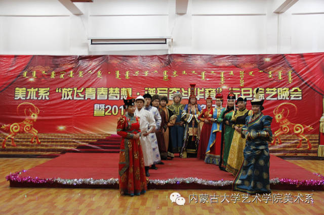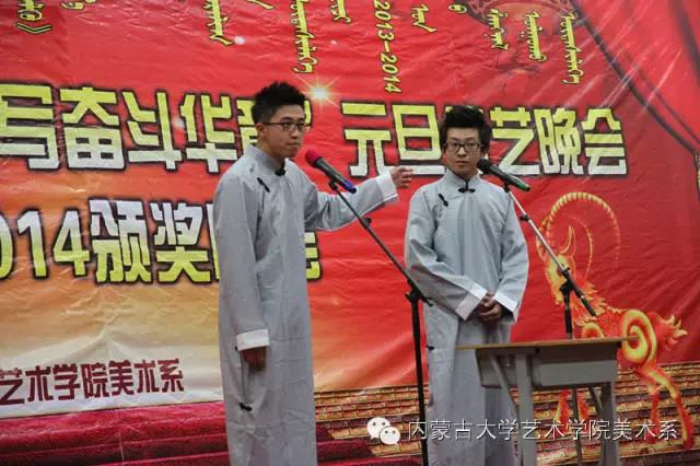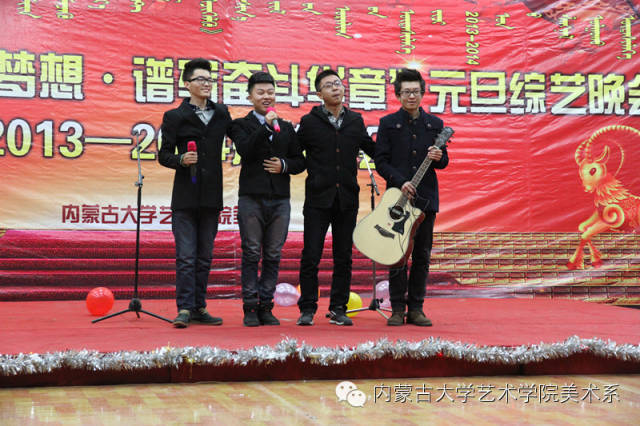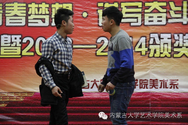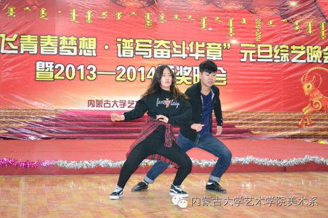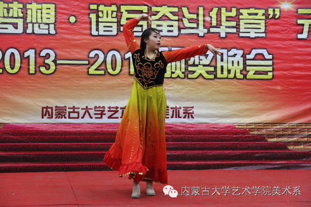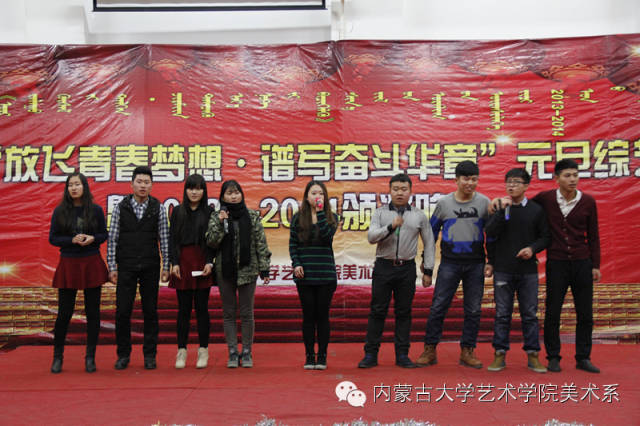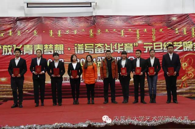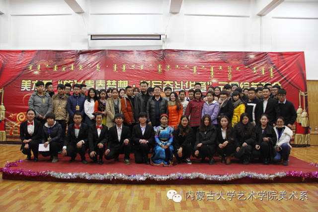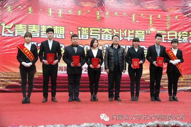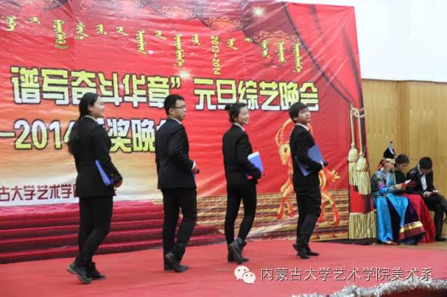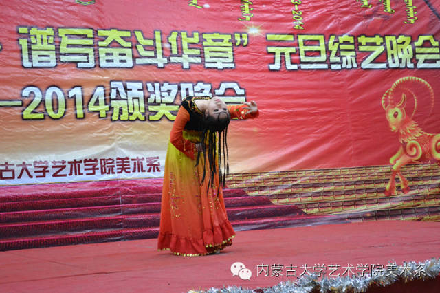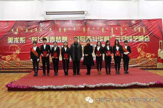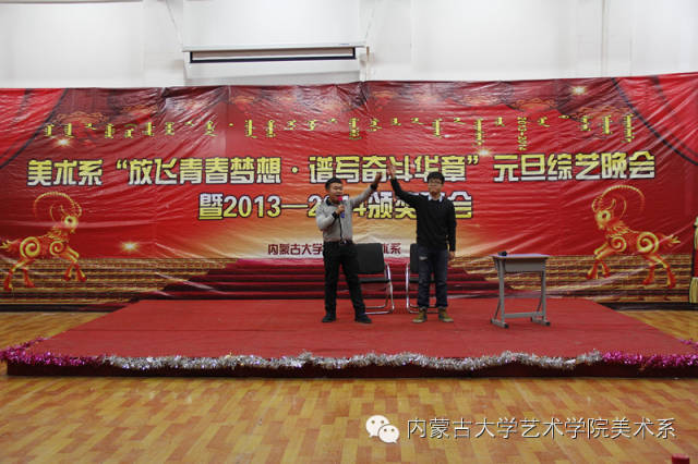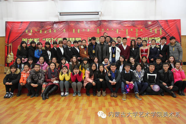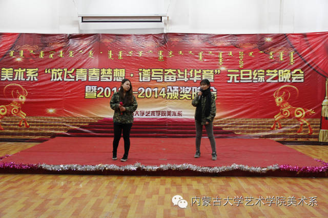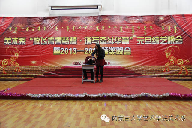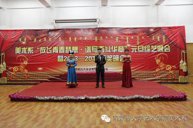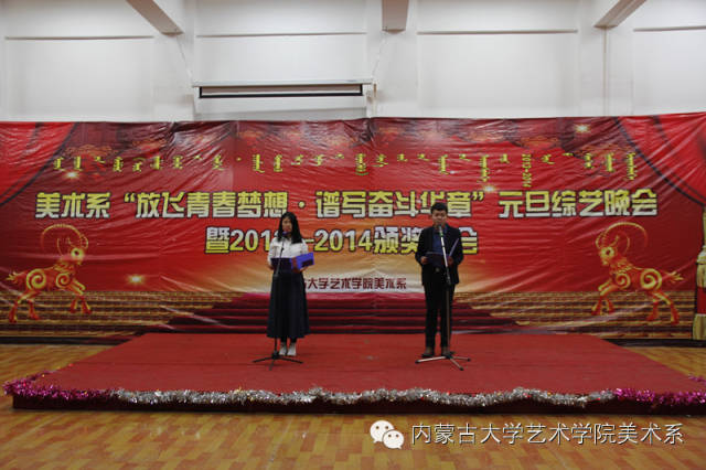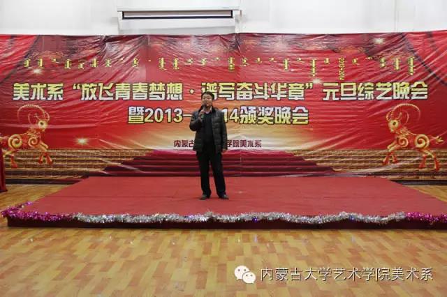 2014年12月30日,美术系成功举办了“放飞青春梦想▪谱写奋斗华章”元旦晚会暨2014年颁奖晚会。美术系党总支书记李建中老师、系主任吴苏荣贵老师、团总支书记王磊老师、办公室副主任桂晓英老师、教务办副主任朱向峰老师以及我系各专业400余名学生一起观看了联欢会。丹麦华裔艺术家、艺术学院客座教授王彤老师受邀参加了本次晚会。