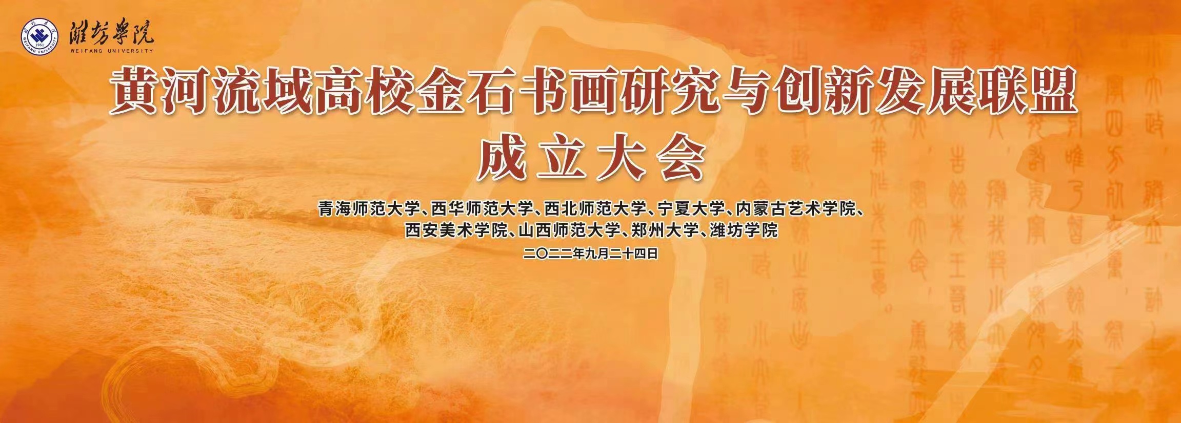 “黄河流域高校金石书画研究与创新发展联盟”由沿黄省区的青海师范大学、西华师范大学、西北师范大学、宁夏大学、内蒙古艺术学院、西安美术学院、山西师范大学、郑州大学、潍坊学院九所包含书法学、美术学、金石研究学科的高校共同谋划,成立,在成立大会上讨论并通过了《联盟公约》及《联盟誓言》。“黄河流域高校金石书画研究与创新发展联盟”的成立有利于构建我校特色学科专业体系、建设高层次人才培育基地,加快研究成果的转移转化,推动黄河文化传承和发展。