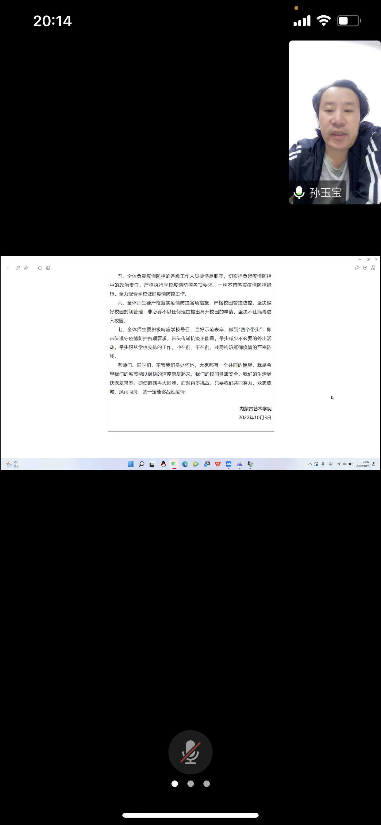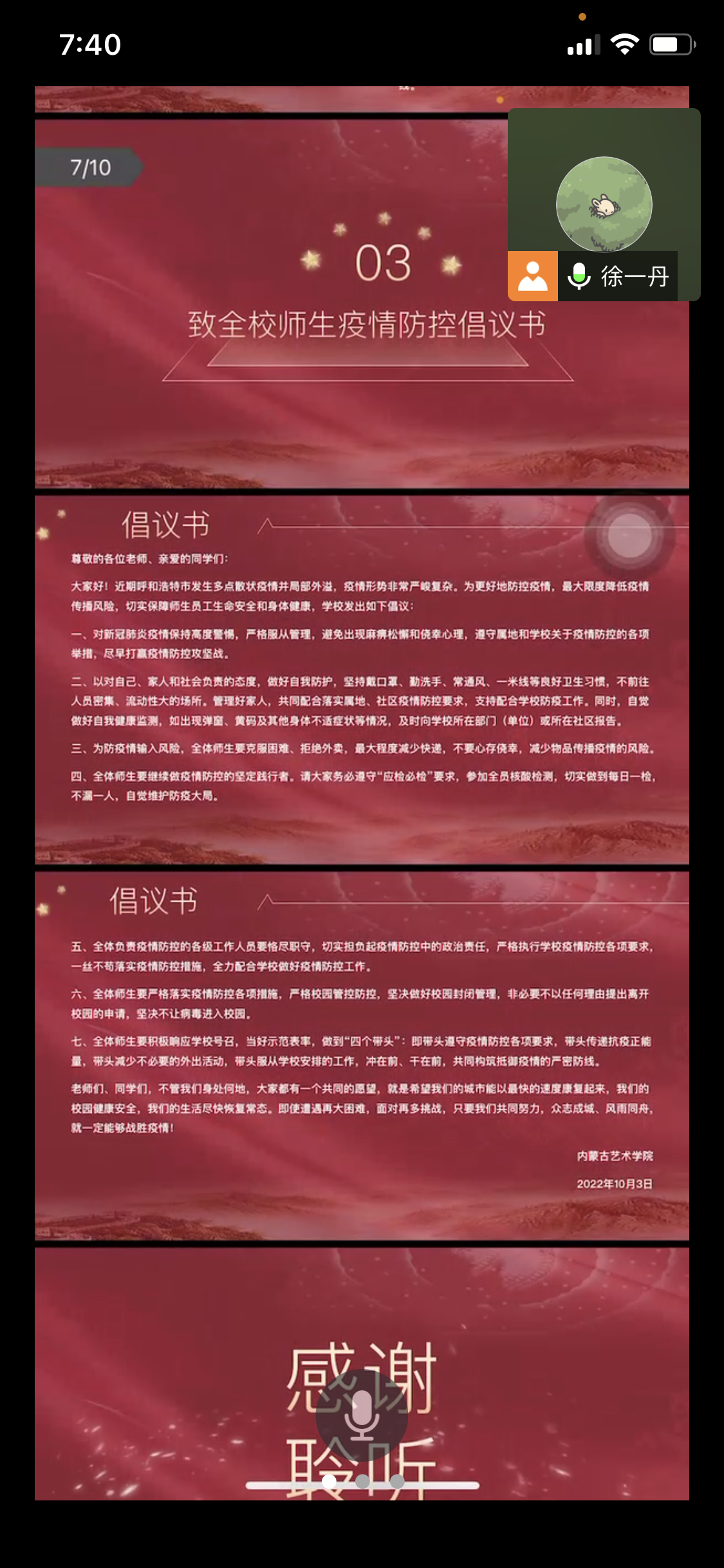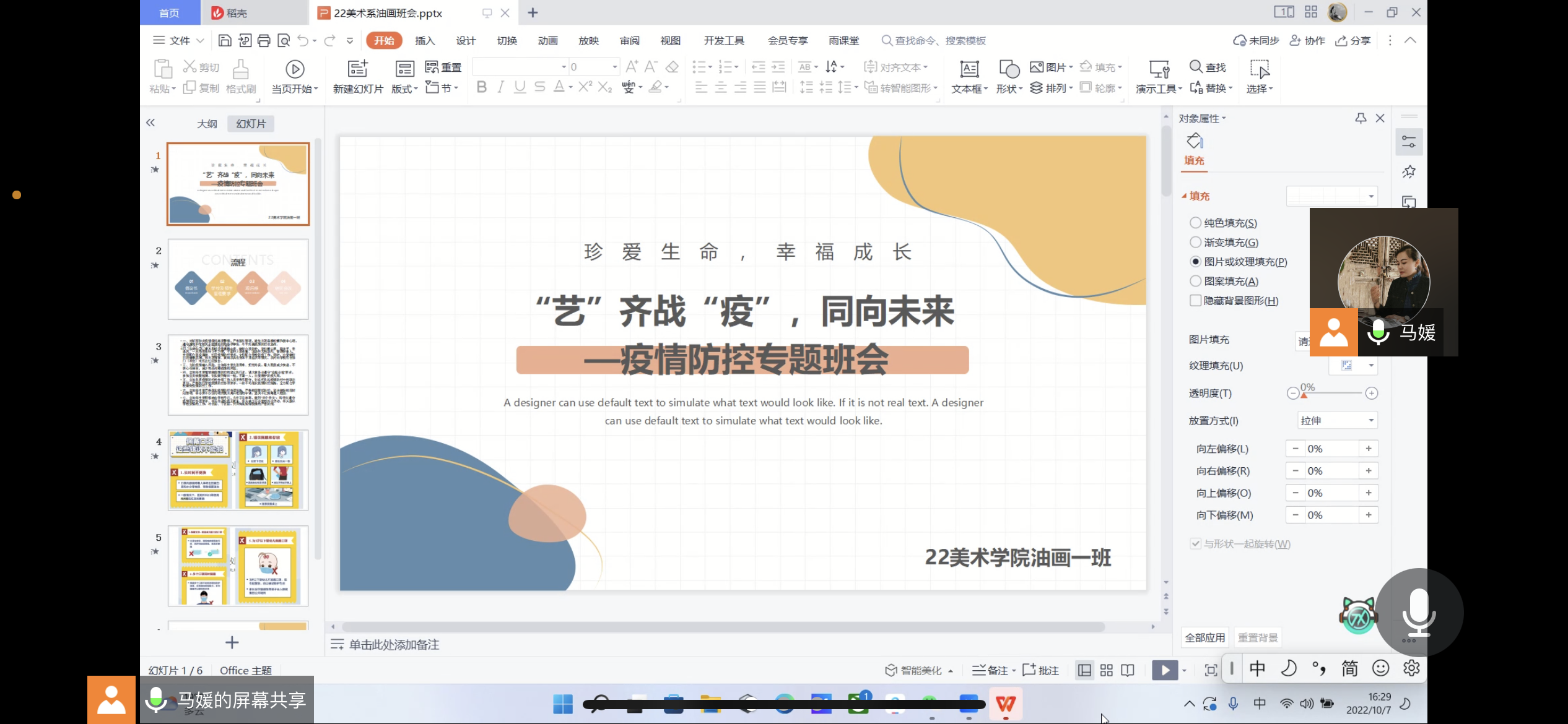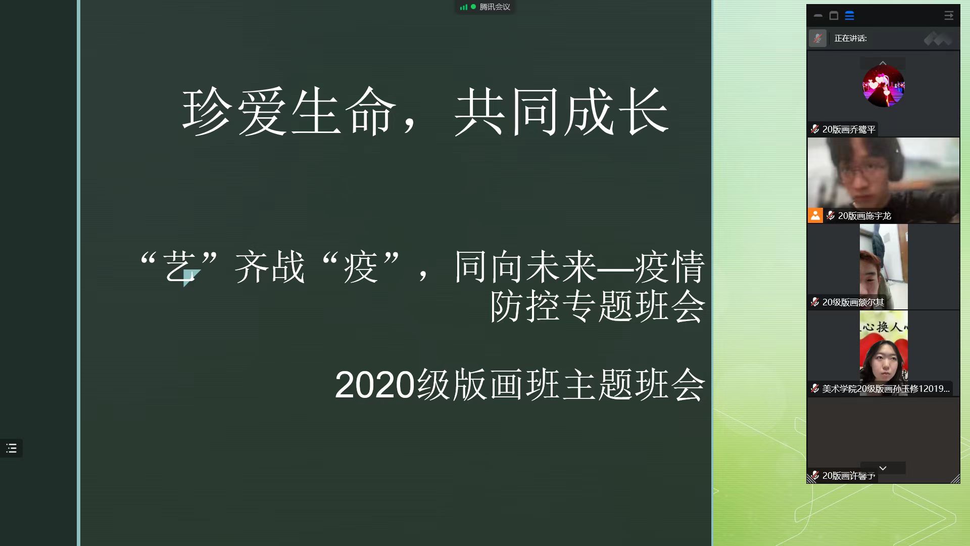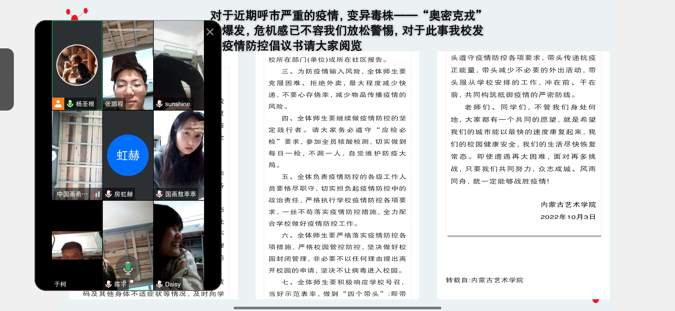 为进一步团结组织同学们配合防疫工作,提高同学们的防控意识应对能力,筑牢思想统一战线,共同树立抗疫必胜的信心和决心。2022年10月6日—8日,美术学院组织各班开展“艺”齐战“疫”,同向未来——疫情防控线上主题班会。此会议覆盖我院全体学生,切实做到防患于未然。