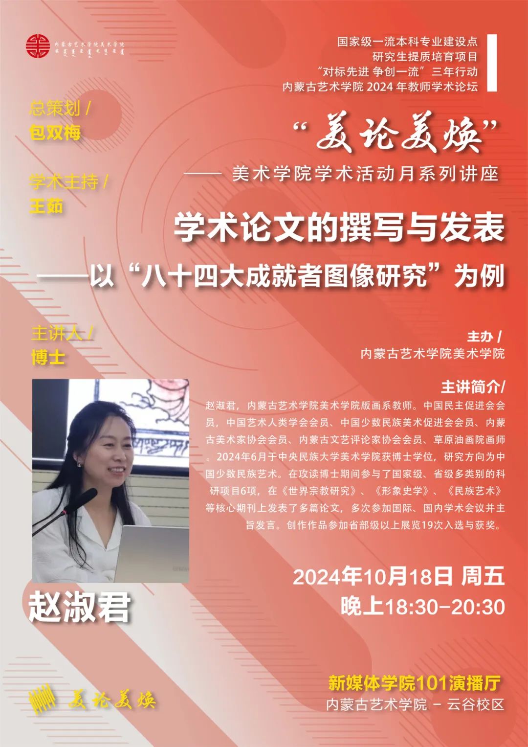 2024年10月18日晚,赵淑君博士《学术论文的撰写与发表-以“八十四大成就者”图像研究为例》讲座在云谷校区新媒体学院101演播厅举办。内蒙古艺术学院师生共计180余人参加了讲座。此次讲座由美术学院院长包双梅主持。