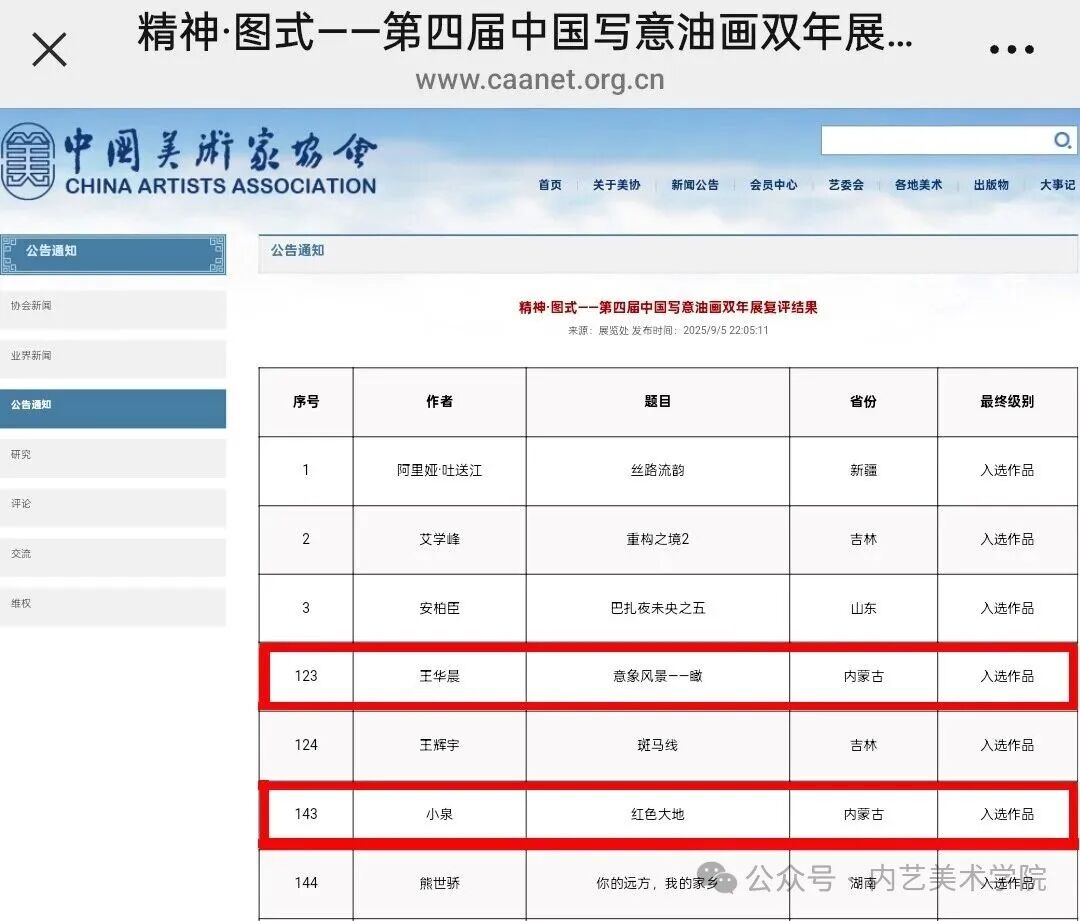 9月5日,由中国美术家协会、北京当代中国写意油画研究院和吉林艺术学院共同举办的“精神·图式——第四届中国写意油画双年展”复评结果正式揭晓。我院教师王华晨副教授的作品《意象风景——瞰》、包双梅教授指导的2022级硕士研究生小泉的毕业创作作品《红色大地》 成功入选。