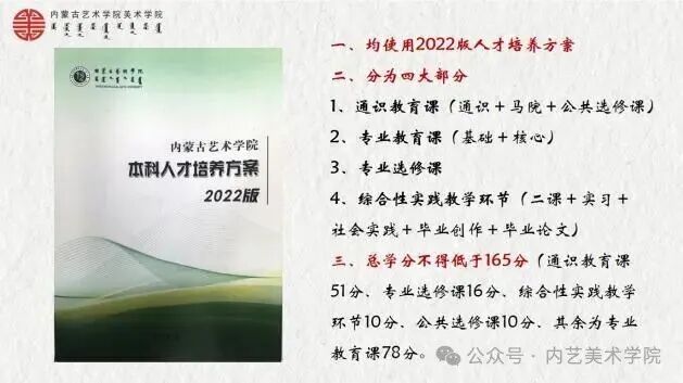 首先伊晨老师以“明晰培养路径,夯实学习基础”为核心,围绕新生最关心的专业学习问题展开详细讲解。全面解读了美术学院2022版人才培养方案,包括各个专业的课程设置、课程体系、学分要求以及实践教学环节等重要内容,帮助同学们清晰掌握大学四年的学习脉络,明确不同阶段的学业目标。