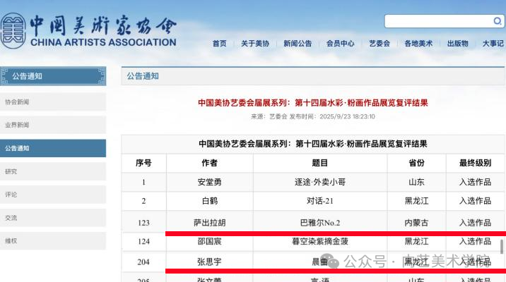 2025年9月23日,由中国美术家协会、黑龙江省文学艺术界联合会联合举办的“第十四届水彩·粉画作品展览”复评结果正式揭晓。我院颉元芳教授指导的2022级水彩画研究生张思宇的毕业创作作品《晨曲》、2023级水彩画研究生萨出拉胡的作品《巴雅尔No.2》成功入选。