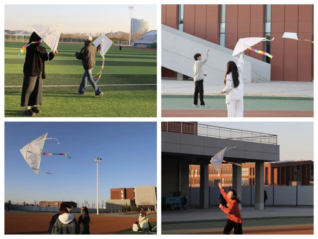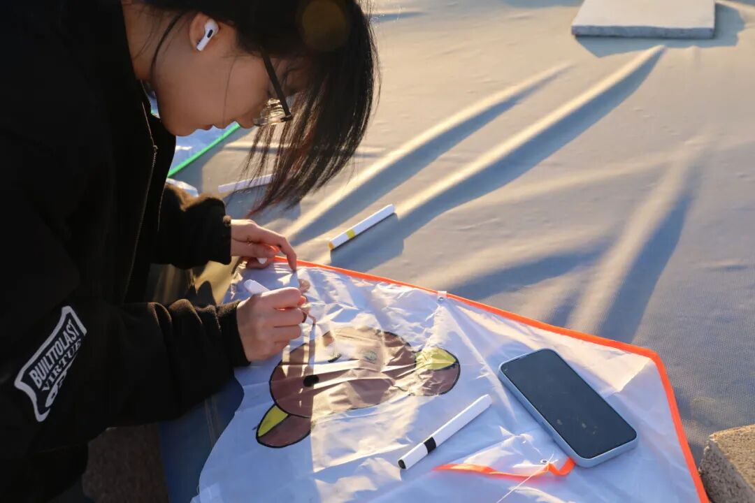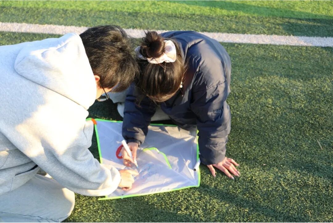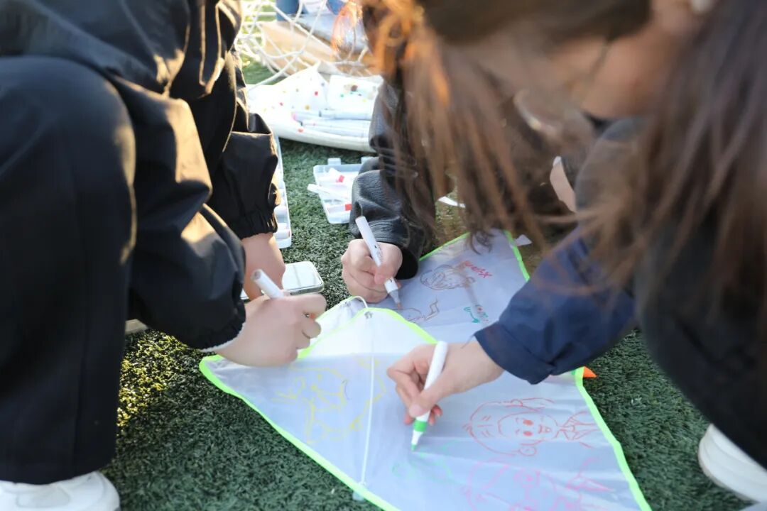 在这充满创意的活动中,同学们拿起画笔,在白色的风筝上尽情挥洒自己的想象,每一笔都充满了创意和个性。随后,他们分组合作,将承载着梦想和希望的风筝放飞到蓝天中。在春日暖阳中奔跑、创作、放飞,为学生提供了释放学业压力、调节情绪的窗口。通过艺术表达与户外运动,学生得以舒缓身心,提升幸福感。